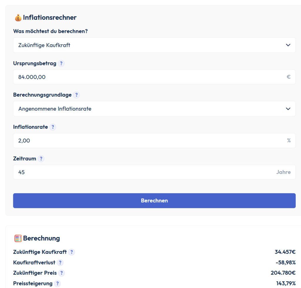 - Wenn man die Laufzeit nimmt und die 84.000 € nach 47 Jahren für 100 € im Monat ansetzt, entsprechen die 84.000 € zur Rente, bei Berücksichtigung der Inflation, nur noch einer Kaufkraft von ca. 34.000 €. Das klingt schon gar nicht mehr sooo gut.